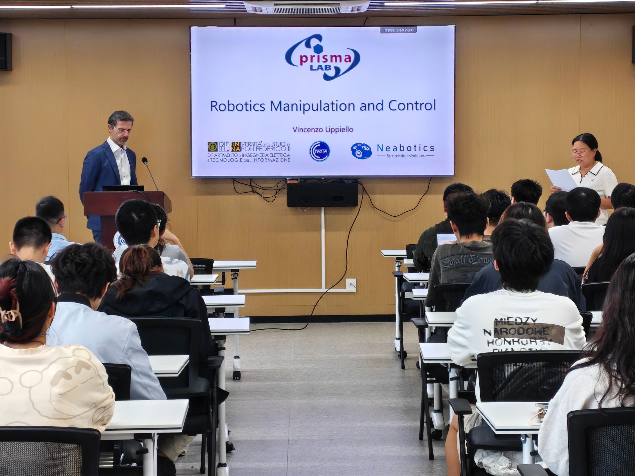 2025年11月18日上午10:00,由beat365在线唯一官网主办的专题学术讲座在海甸校区学院二楼顺利举行。本次讲座以“Robotized Solutions for Work at Height: From Aerial Manipulation to Hybrid Mobility Systems”为主题,由学院李娜副院长主持,意大利那不勒斯费德里科二世大学 Vincenzo Lippiello 教授担任主讲嘉宾。学院师生积极参加,现场气氛浓厚。
