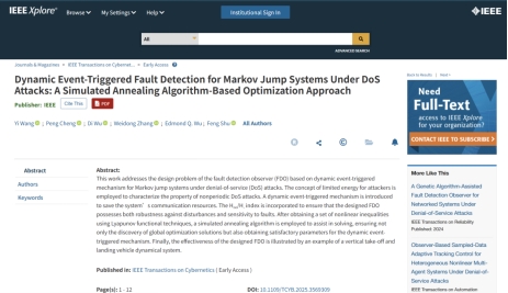 论文信息:Yi Wang; Peng Cheng; Di Wu*; Weidong Zhang; Edmond Q. Wu; Feng Shu. Dynamic Event-Triggered Fault Detection for Markov Jump Systems Under DoS Attacks: A Simulated Annealing Algorithm-Based Optimization Approach[J]. IEEE transactions on cybernetics. DOI: 10.1109/TCYB.2025.3569309.